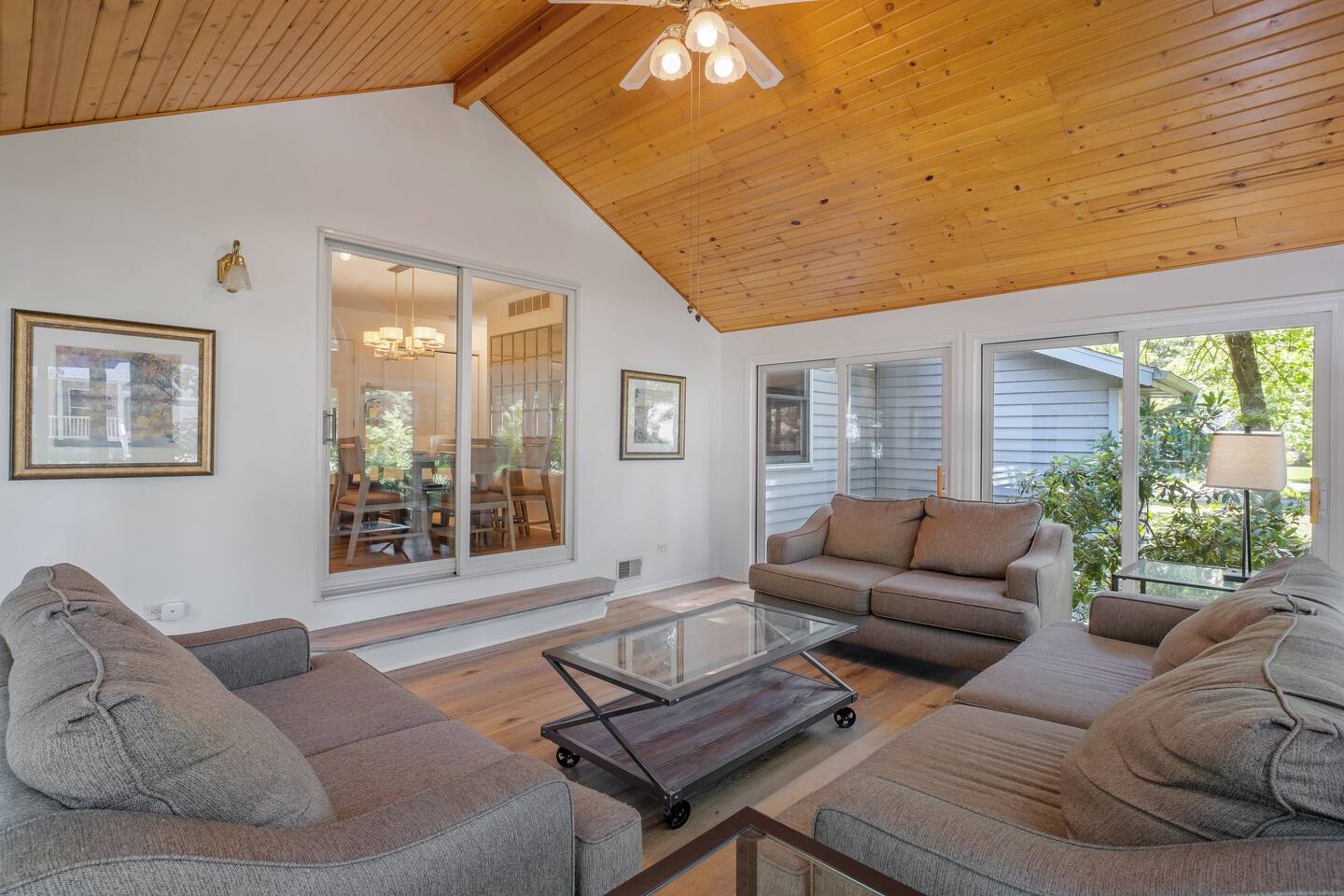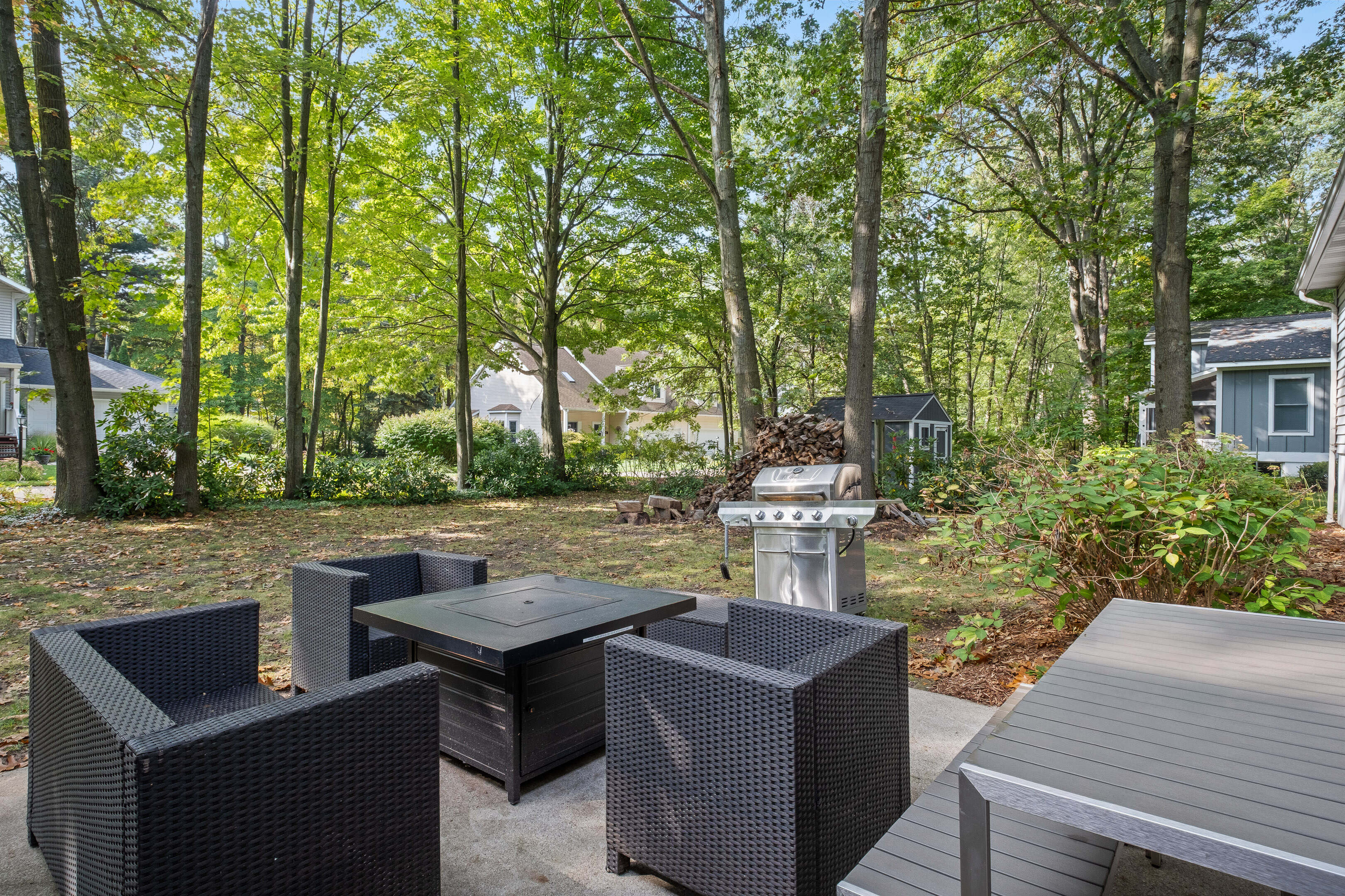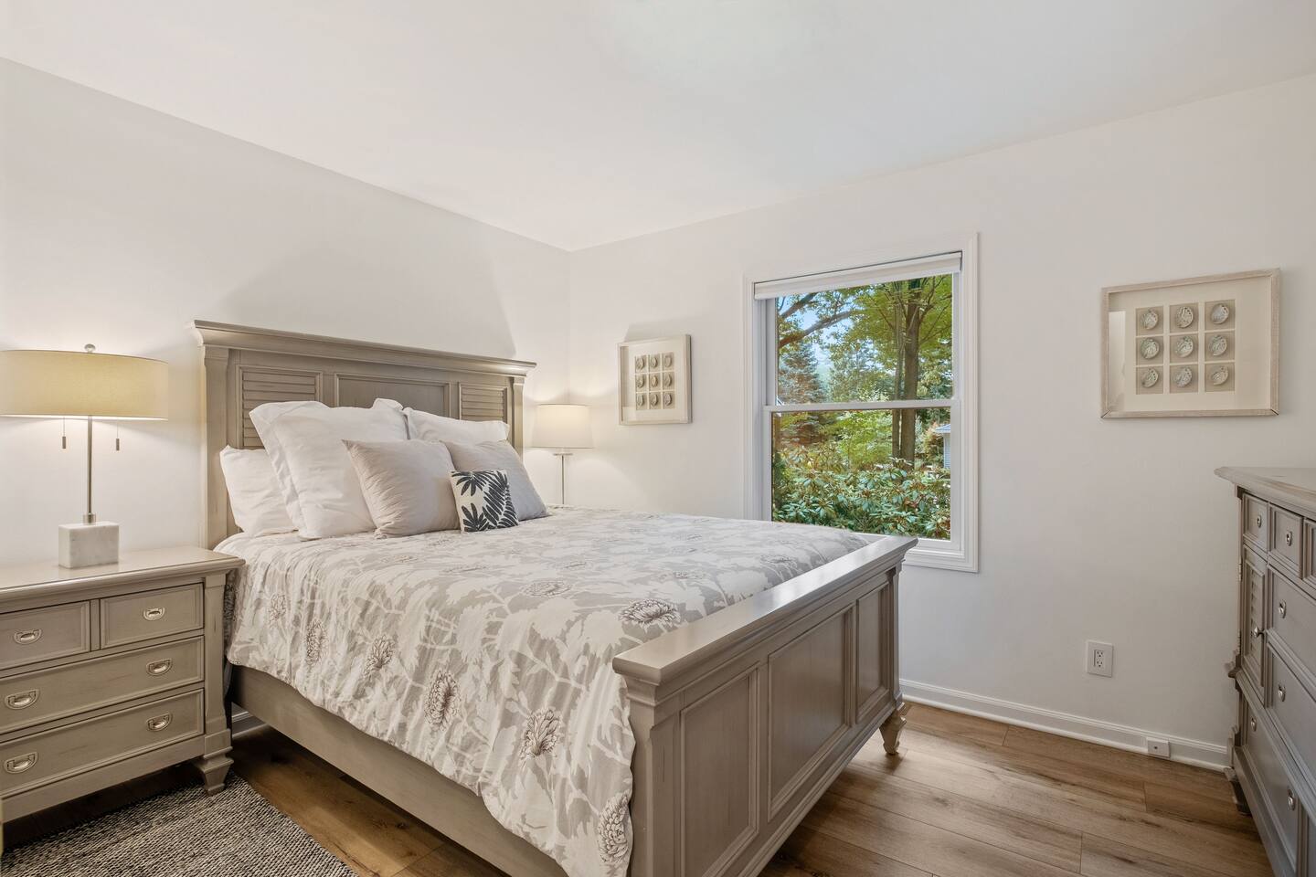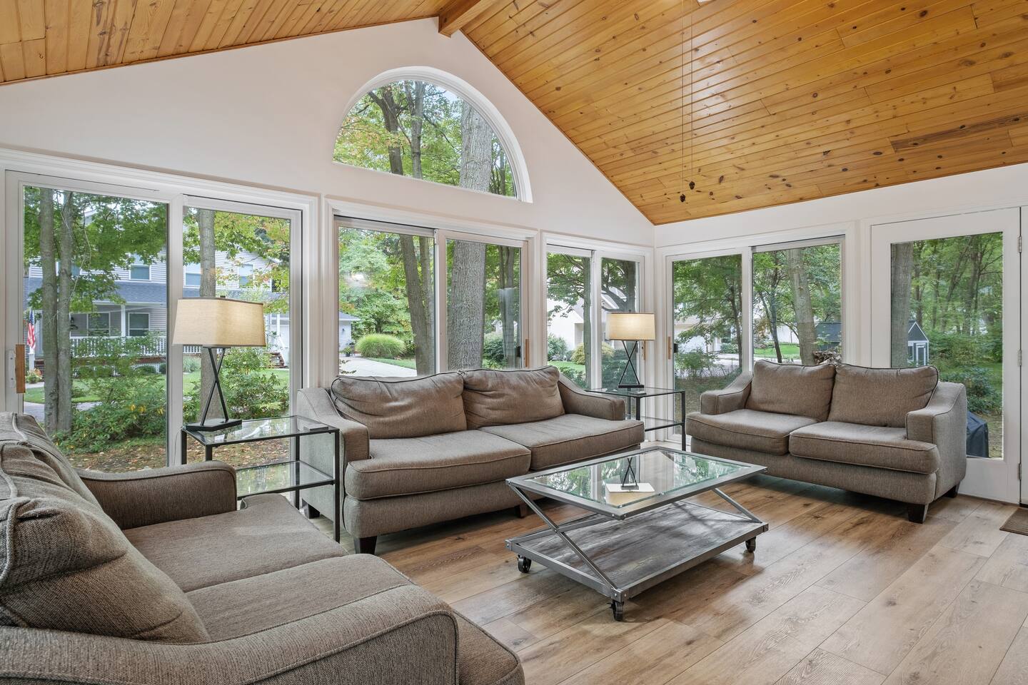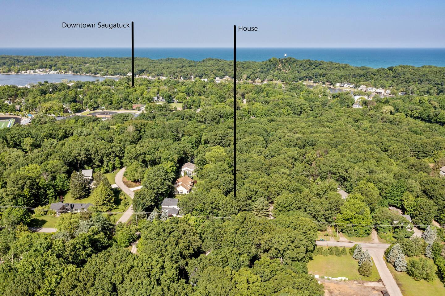 Welcome to your home away from home here in Saugatuck! The first thing you'll notice is how sparkling clean the house is. That's because we partner the absolute best cleaning partners in the biz. Next you'll be amazed how much bigger the home is than it looks in the pictures. The Main Floor is where the adults will spend most of their time, between the fully stocked kitchen, sitting area with smart TV, or my personal favorite the Four Seasons room with windows on three sides. There's also the king master suite and a queen bedroom on the Main Floor, easy for anyone who doesn't do well with stairs. Additional highlights: ~Seating for fifteen between the dining table and kitchen counter ~Large front porch w/ Adirondack chairs for sipping coffee in the morning ~Two car garage, driveway parking, basketball hoop ~Outdoor games (Bocce Ball, Corn Hole, Croquet, Horse Shoes, Whiffle Ball, Frisbee) ~Beach gear, including chairs, towels, and beach toys ~Patio area in backyard w/ couches and fire pit* ~Living room w/ wood burning fireplace*, 55" TV, and board games ~BBQ grill ~Fully stocked kitchen, including all the cooking utensils you will need, coffee station with drip and Keurig ~Half bath ~Laundry room ~Four Season Sun Room directly off the kitchen that looks out into beautiful wooded and landscaped yard. Sadly, the floor to ceiling windows can't be opened for the safety of our guests. Additionally, we've had too many noise complaints stemming from how well sound travels from this room with the windows open. ~Master bedroom w/ Memory Foam King Bed, real down pillows, down duvet, walk-in closet and en-suite full bathroom ~Second bedroom w/ Memory Foam Queen Bed, real down pillows, down duvet ★”Beds are so comfortable.” - Super Guest If you're tired or want to get some work done, head upstairs where you'll find the third and fourth bedrooms as well as a quiet office area. ~Office and sitting area w/42" Smart TV ~Third bedroom w/memory foam king bed, down alternative pillows and duvet, and additional smaller day bed, great to relax during the day or for children to sleep ~Fourth bedroom with two memory foam king beds, real down pillow and duvets, and a crib for the littlest ones ~Full bathroom If you're looking to play, head downstairs where you'll find activities that will keep your kids from ever having reason to say "I'm bored". This is also where the fifth bedroom is located. ~Game room with shuffleboard, foosball, and more ~Children's play area with toys, pretend play features, and lots of places to hide ~Sofa and 65" Smart TV ~Wet bar ~Bedroom with two queen memory foam beds with real down pillow and duvets ~Full bathroom w/tub (Note: please do not use the jets! They are broken.)