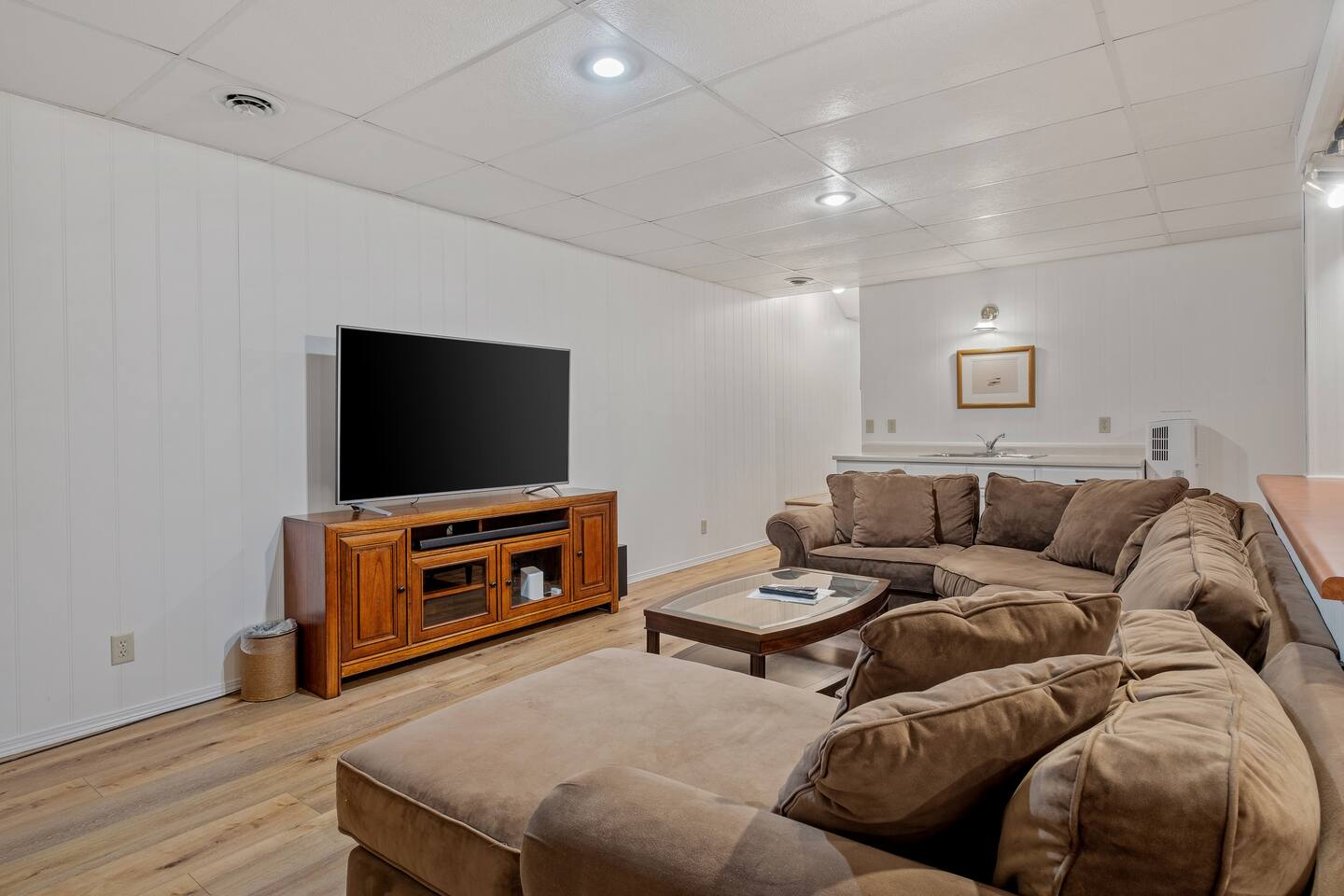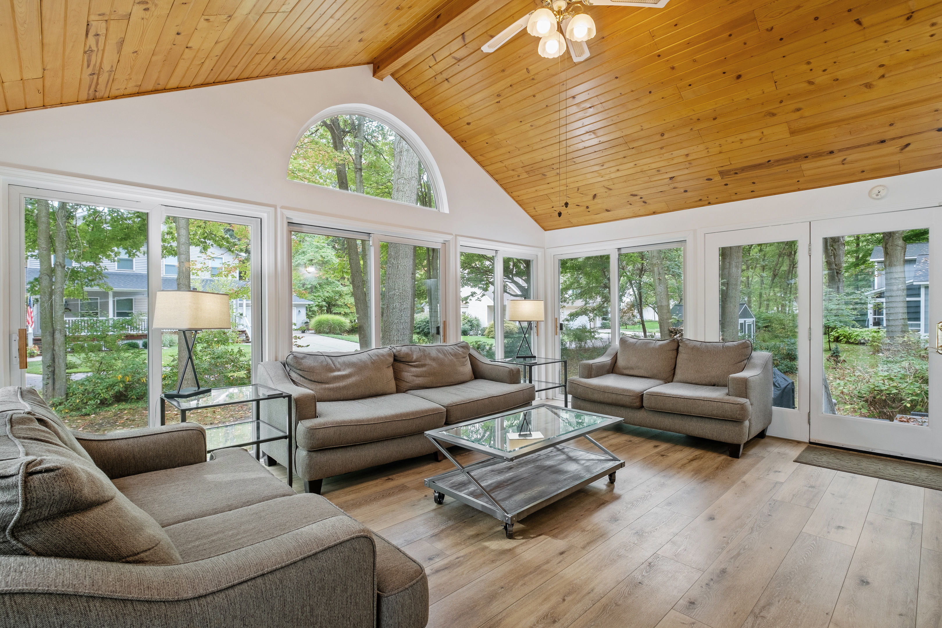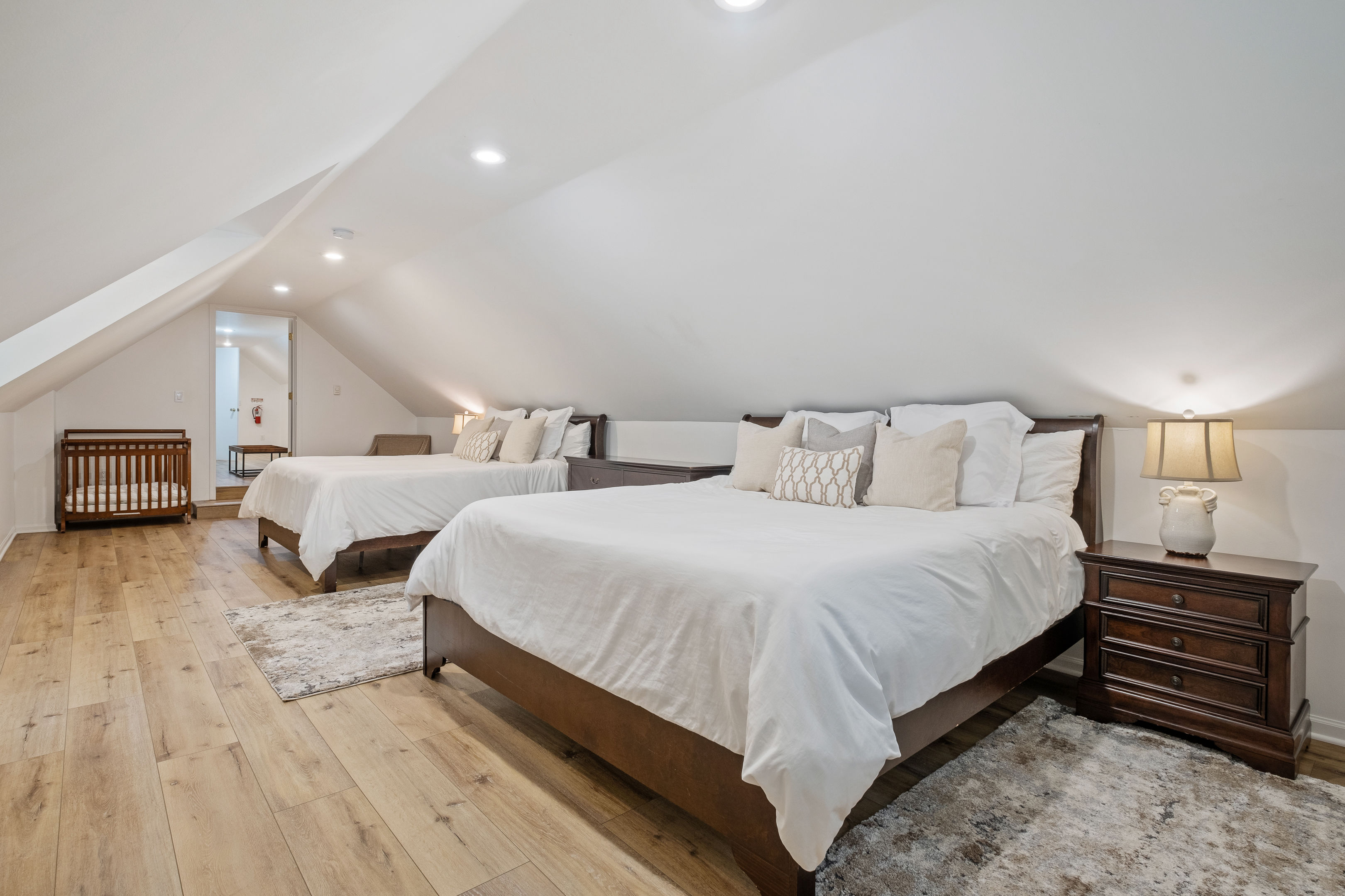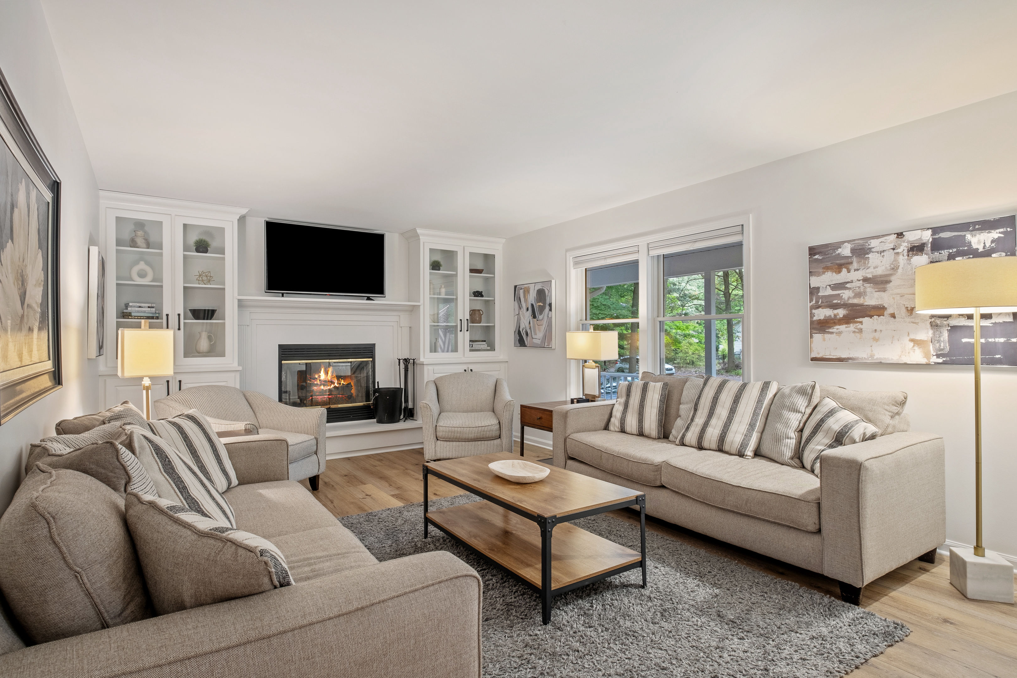Welcome to your home away from home here in Saugatuck! The first thing you'll notice is how sparkling clean the house is. That's because we partner the absolute best cleaning partners in the biz. Next you'll be amazed how much bigger the home is than it looks in the pictures. The Main Floor is where the adults will spend most of their time, between the fully stocked kitchen, sitting area with smart TV, or my personal favorite the Four Seasons room with windows on three sides. There's also the king master suite and a queen bedroom on the Main Floor, easy for anyone who doesn't do well with stairs. Additional highlights: ~Seating for fifteen between the dining table and kitchen counter ~Large front porch w/ Adirondack chairs for sipping coffee in the morning ~Two car garage, driveway parking, basketball hoop ~Outdoor games (Bocce Ball, Corn Hole, Croquet, Horse Shoes, Whiffle Ball, Frisbee) ~Beach gear, including chairs, towels, and beach toys ~Patio area in backyard w/ couches and fire pit* ~Living room w/ wood burning fireplace*, 55" TV, and board games ~BBQ grill ~Fully stocked kitchen, including all the cooking utensils you will need, coffee station with drip and Keurig ~Half bath ~Laundry room ~Four Season Sun Room directly off the kitchen that looks out into beautiful wooded and landscaped yard. Sadly, the floor to ceiling windows can't be opened for the safety of our guests. Additionally, we've had too many noise complaints stemming from how well sound travels from this room with the windows open. ~Master bedroom w/ Memory Foam King Bed, real down pillows, down duvet, walk-in closet and en-suite full bathroom ~Second bedroom w/ Memory Foam Queen Bed, real down pillows, down duvet ★”Beds are so comfortable.” - Super Guest If you're tired or want to get some work done, head upstairs where you'll find the third and fourth bedrooms as well as a quiet office area. ~Office and sitting area w/42" Smart TV ~Third bedroom w/memory foam king bed, down alternative pillows and duvet, and additional smaller day bed, great to relax during the day or for children to sleep ~Fourth bedroom with two memory foam king beds, real down pillow and duvets, and a crib for the littlest ones ~Full bathroom If you're looking to play, head downstairs where you'll find activities that will keep your kids from ever having reason to say "I'm bored". This is also where the fifth bedroom is located. ~Game room with shuffleboard, foosball, and more ~Children's play area with toys, pretend play features, and lots of places to hide ~Sofa and 65" Smart TV ~Wet bar ~Bedroom with two queen memory foam beds with real down pillow and duvets ~Full bathroom w/tub (Note: please do not use the jets! They are broken.)