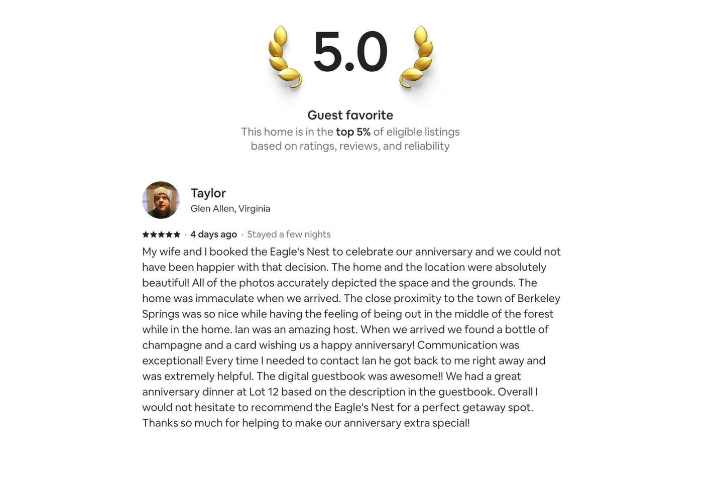 Additional Accommodation Traveling in a larger group, or your preferred dates are already taken? You'll be happy to know that we offer additional accommodation in Berkeley Springs. Please browse our host profile for the complete list of gorgeous listings. Please note: We have a 2nd home on the property that is also available to rent called Ridgeview. There may be guests there during your stay. The Nest is about fifty feet down the path from the main house. They are far enough apart and oriented in such a way that privacy for all is maintained. The Nest rear deck is partially visible from areas of the main house. If for whatever reason guests at Ridgeview are making your stay anything less than peaceful, please contact us and we will see to it that they respect your quiet enjoyment of the property. Cleaning & Sanitization - Health, safety, and well-being of our guests are of utmost importance. For this reason, we use a thorough cleaning process after each check-out. Not Pets Allowes - We love those little (and not so little) furry bundles of joy. Sadly, our home is not suitable for accommodating them. No Smoking Inside - Please refrain from smoking inside the home! Any smoking evidence will result in a fee for odor removal and furniture cleaning. No Parties/Events - We kindly ask you to treat our home as your own to preserve its pristine condition for future guests and your return visits. The minimum age to book is 25 years old. Thank you very much for your understanding. Important: - Before you arrive you will be asked to complete guest verification. - As stated in our listing, you will be asked to complete guest verification. - 4WD is required during winter months.
